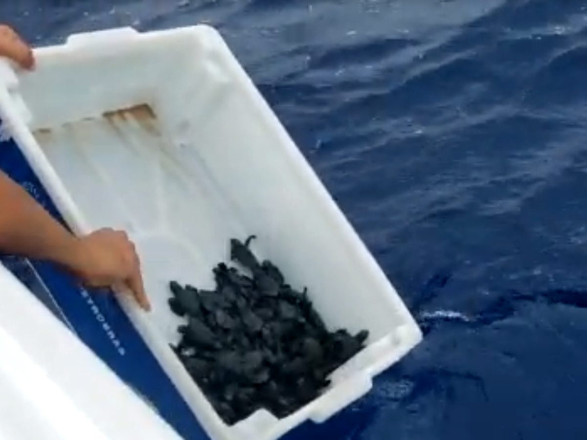 E então as caixas foram colocadas em uma embarcação, que se deslocou a 30 km da costa. Ali, longe do petróleo que apareceu nas praias, as tartarugas foram soltas no mar.
