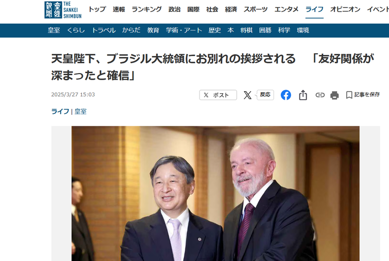 Na versão digital, diversas matérias foram publicadas sobre a comitiva. O principal deles abordou a cúpula entre o presidente brasileiro e o primeiro-ministro japonês, Shigeru Ishiba, realizada na noite de quarta-feira, no Palácio Akasaka, em Tóquio.
