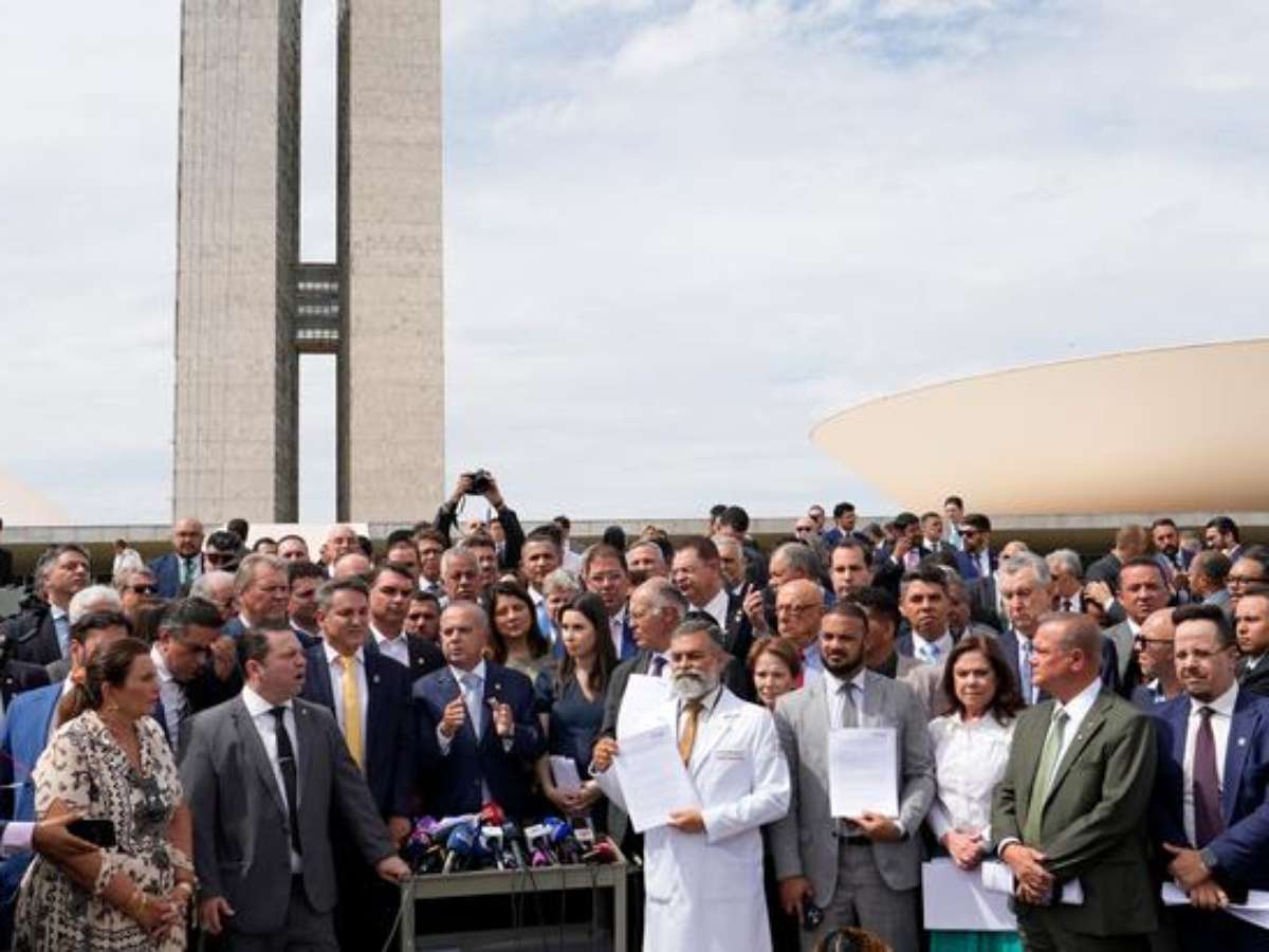 Em coletiva de imprensa em frente ao Congresso Nacional, parlamentares da oposição criticaram a decisão de Moraes que determinou a prisão domiciliar de Bolsonaro.