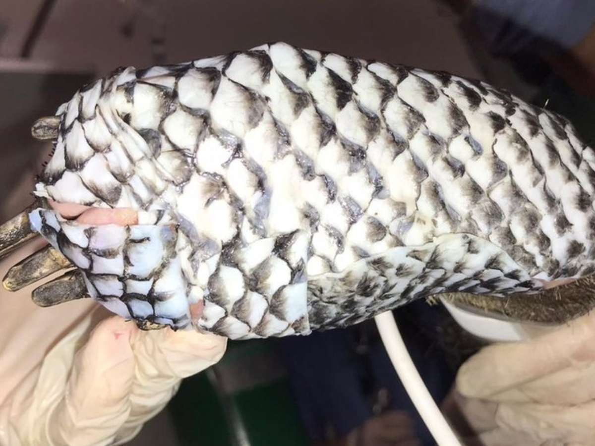 Parece uma cena futurista: um tamanduá-bandeira, com seus grossos pelos marrons, estende as patas estampadas com... pele de tilápia.