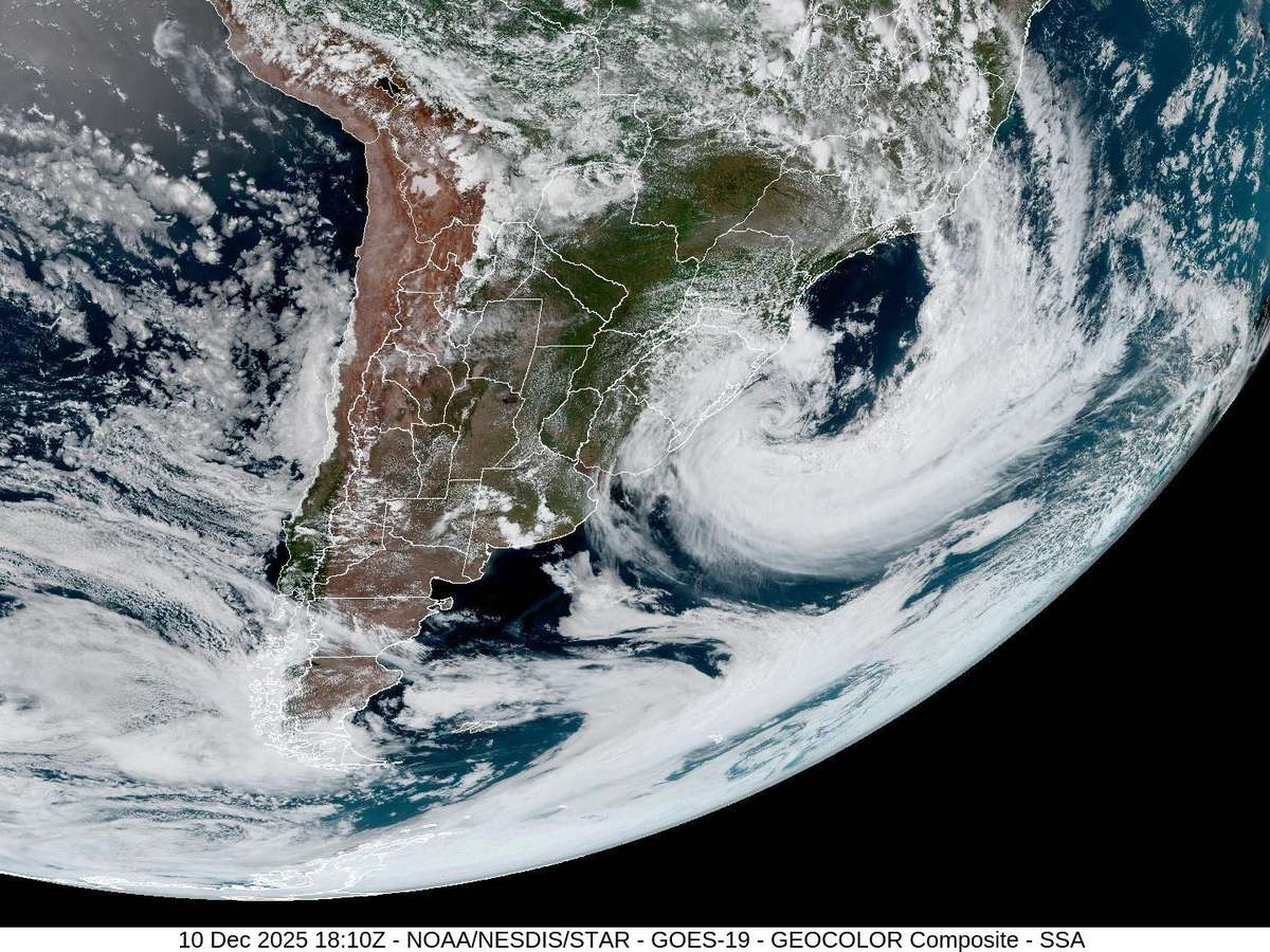 O satélite meteorológico GOES-19 da Nasa, agência espacial dos Estados Unidos, mostra a dimensão do ciclone sobre a região Sul visto do espaço.