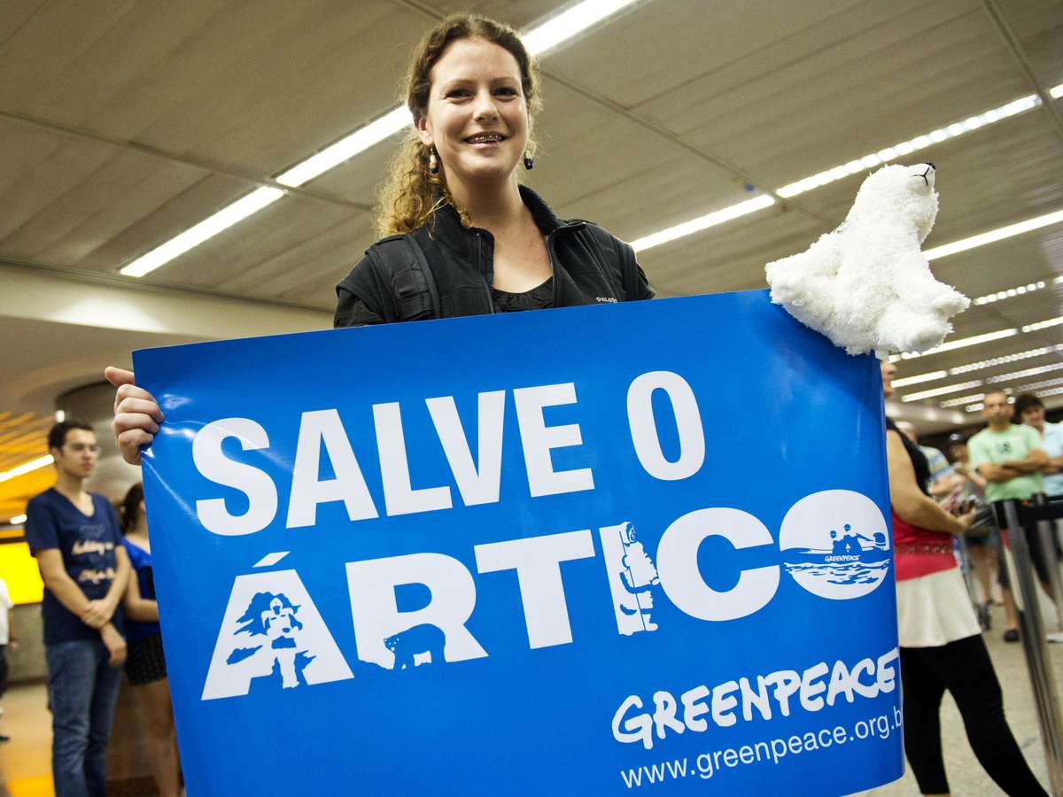 17 de outubro - "Libertem os 30 do Ártico", diz outro cartaz empunhado pela brasileira, em referência ao grupo de ativistas do Greenpeace detidos em setembro durante protesto na Rússia