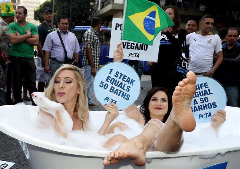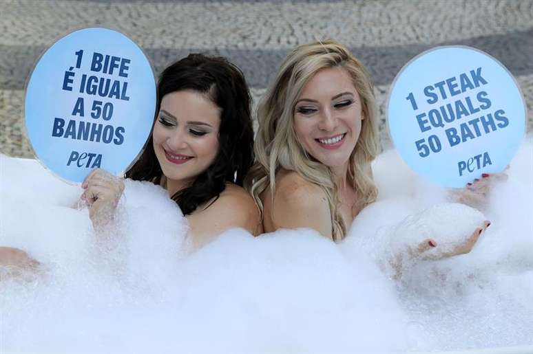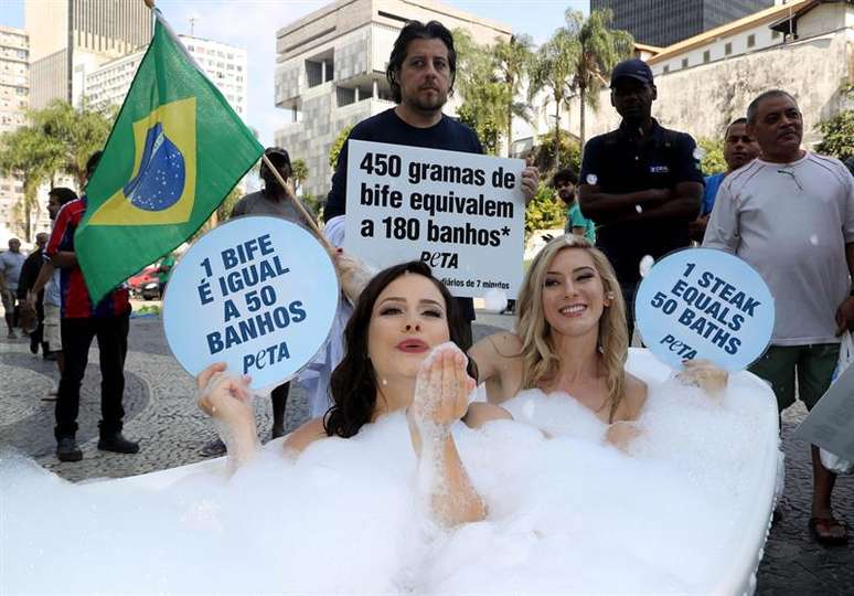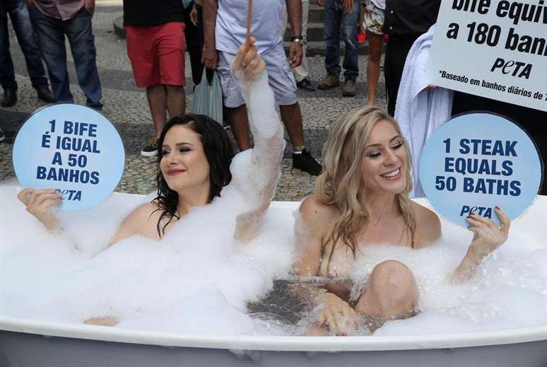 Duas ativistas da organização Pessoas a favor do Tratamento Ético aos Animais (Peta, em inglês) tomaram banho nuas no Largo da Carioca, no centro do Rio de Janeiro, para denunciar que o consumo de carne representa desperdício de grandes quantidades de água.