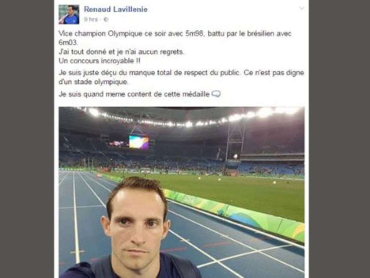 Em um post compartilhado nas redes sociais na noite de segunda-feira, Lavillenie parabeniza o rival brasileiro, mas diz estar "decepcionado"com o que chamou de "total falta de respeito do público".