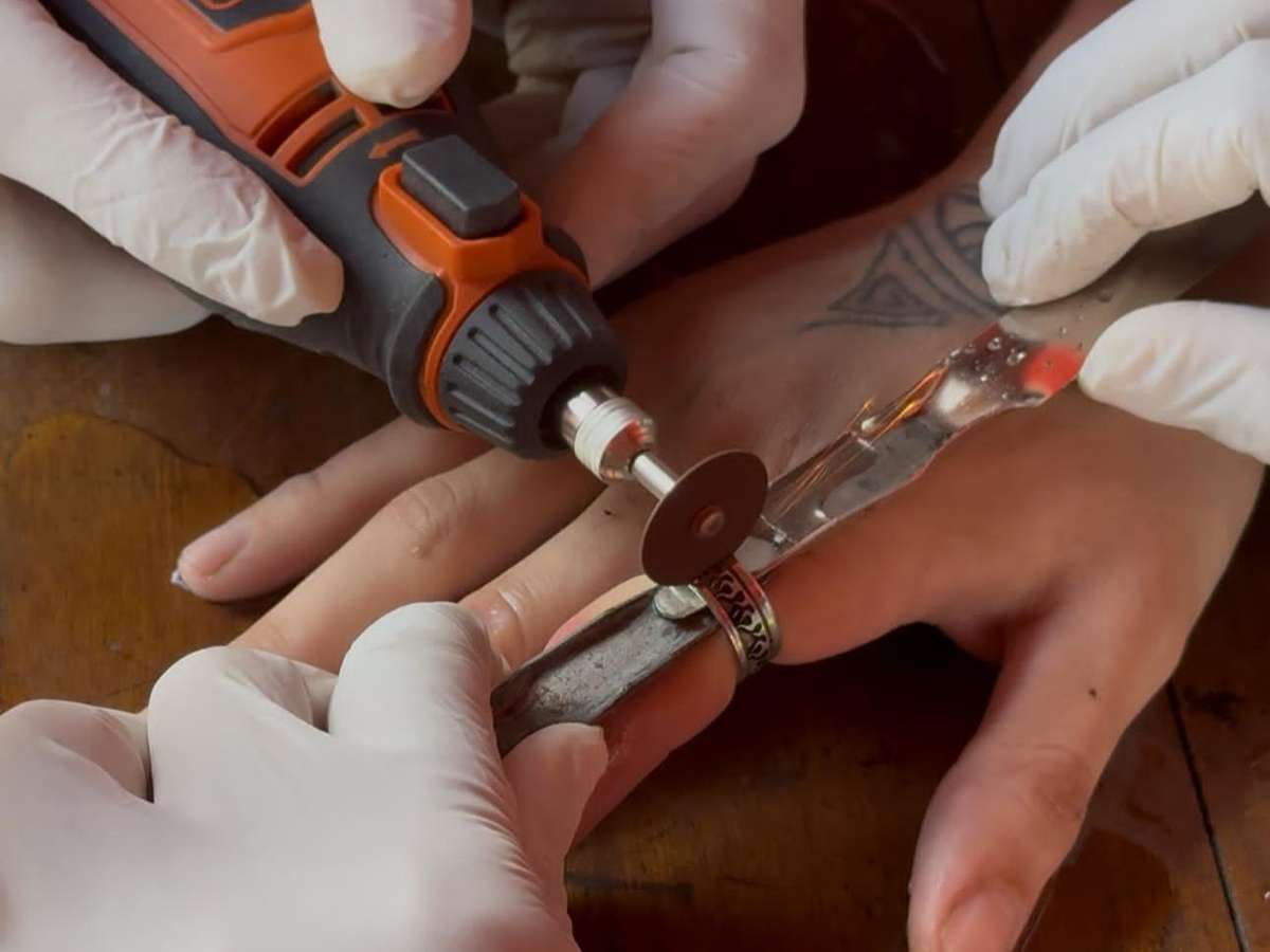 Os bombeiros, em uma força-tarefa, analisaram a situação e entenderam que a técnica mais segura seria corte com a micro retífica, uma ferramenta elétrica de alta rotação e baixo torque, indicada para tarefas de precisão em superfícies pequenas ou delicadas, por conta do edema no dedo anelar da mão direita.