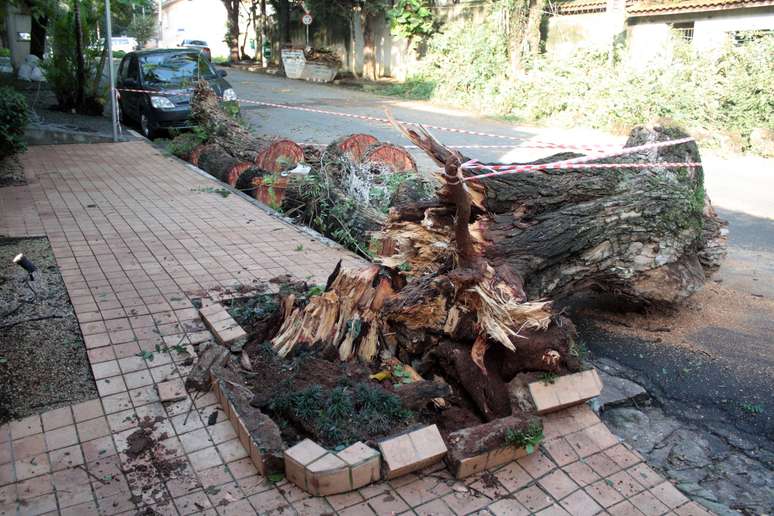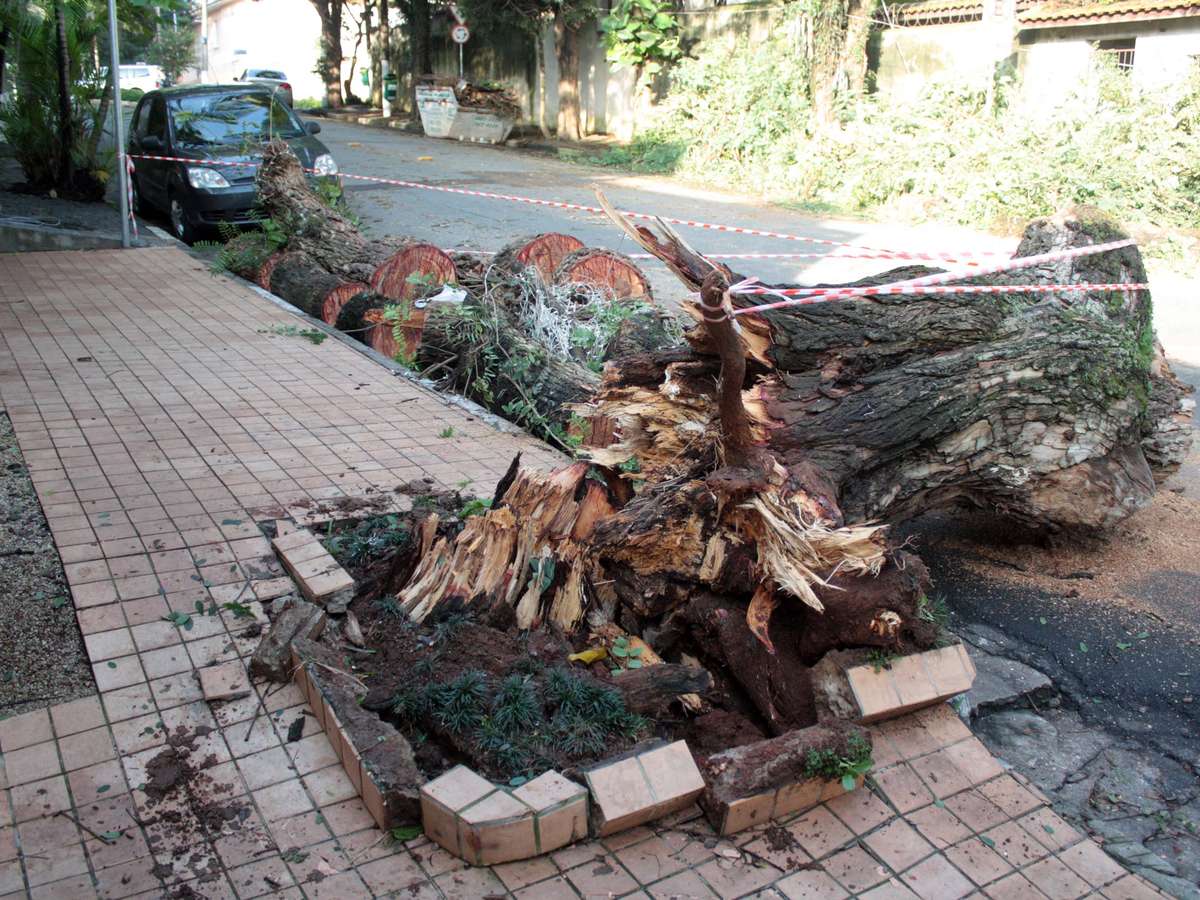 Queda de árvore na Rua Comendador Elias Zarzur junto à Rua Marechal Deodoro, Santo Amaro, zona sul de São Paulo, na manhã deste sábado, após o forte temporal de sexta