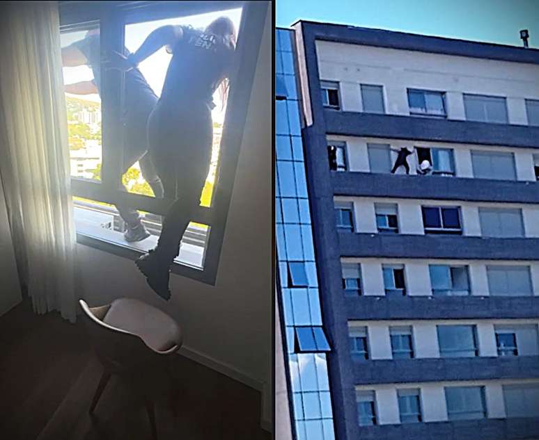 No prédio, moradores relataram que a mulher estava na janela do apartamento em situação de risco iminente de queda. Com ajuda dos residentes, os policiais acessaram o imóvel vizinho e, pela parte externa do prédio, Muniz avançou pela marquise onde ficam os aparelhos de ar-condicionado até alcançar o apartamento da vítima e entrar no local.