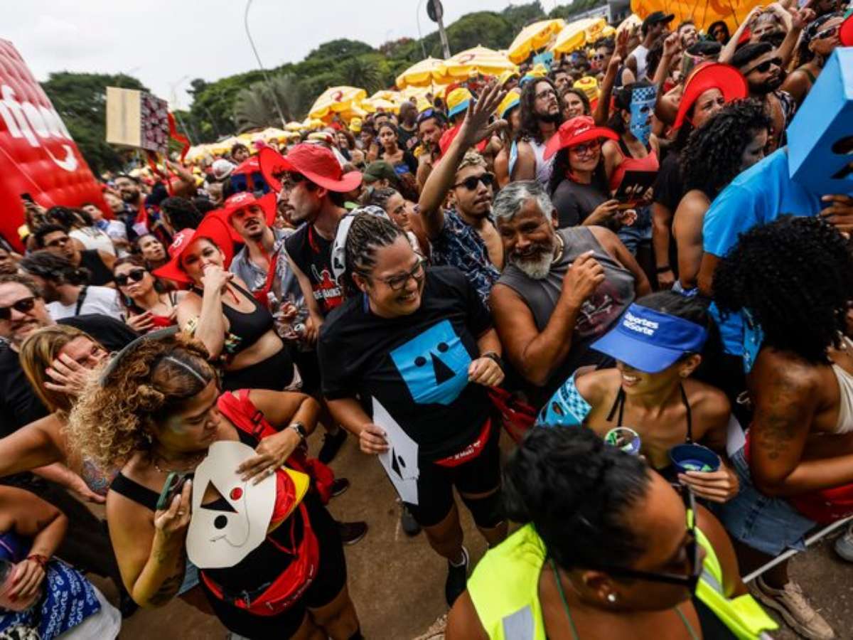Em clima de festa, os foliões dançam e mostram empolgação ao lado do trio. Muitos disseram à reportagem que são fãs da banda e alguns usam camisetas do grupo e máscaras distribuídas pela produção.