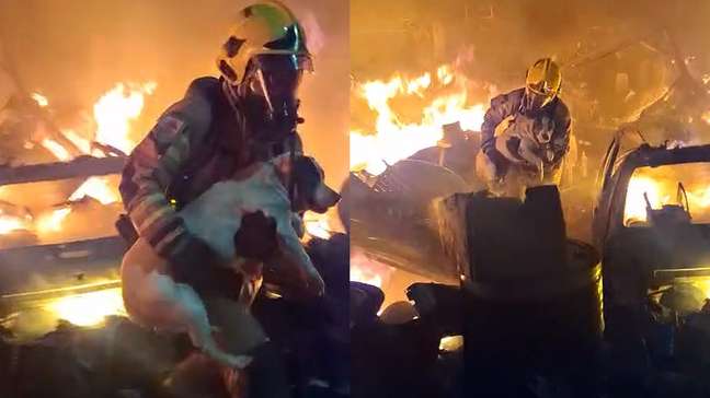 Cadela é resgatada de incêndio de grandes proporções em depósito; veja vídeo