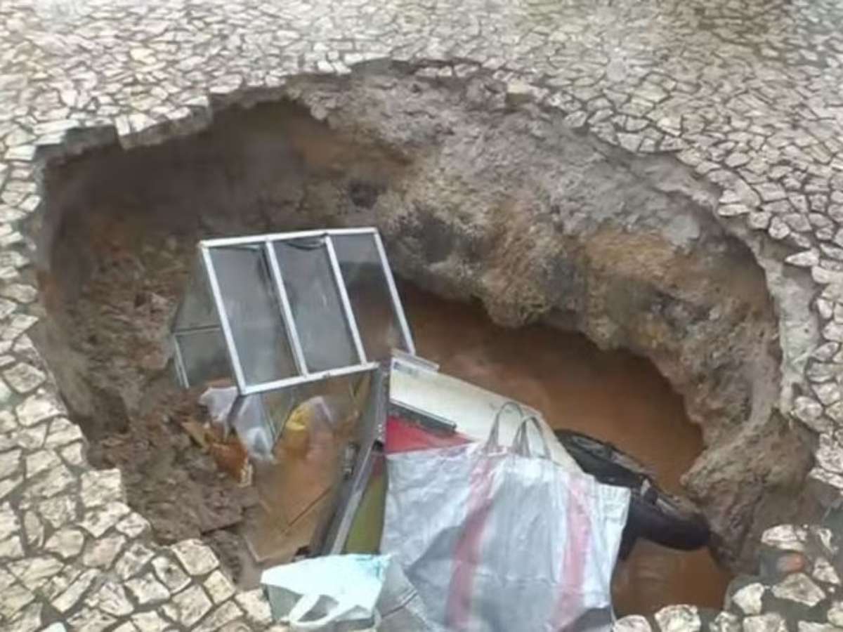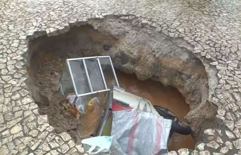 Imagens mostram que, dentro do buraco, passava uma água barrenta; chão cedeu por volta das 6h desta segunda-feira, 22