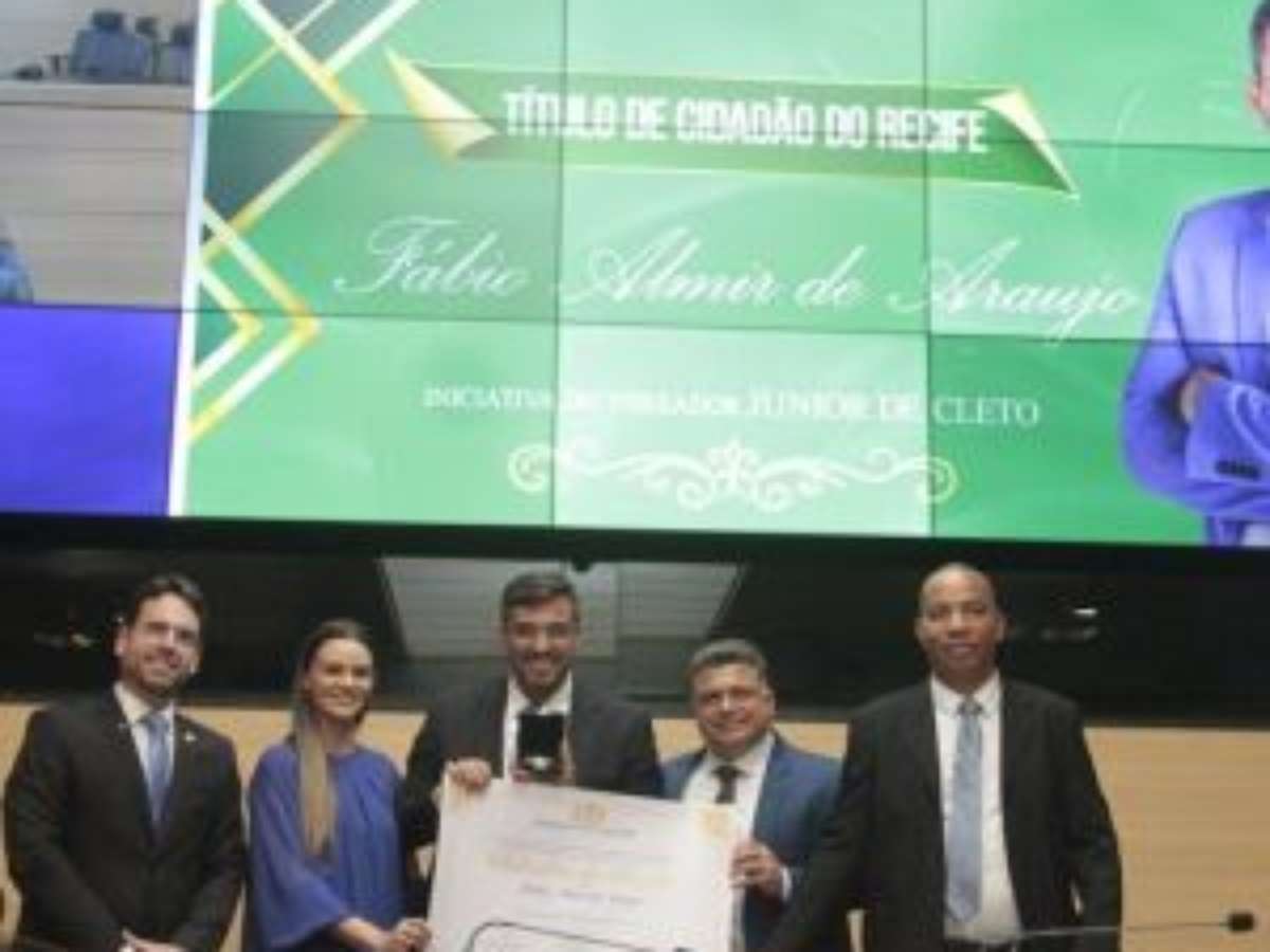 Após o discurso, o vereador Júnior de Cleto fez a entrega do Título de Cidadão do Recife, com a respectiva medalha, a Fábio Araújo. Em extensão à homenagem, a esposa do vereador, Bárbara Estolano, entregou flores à esposa do homenageado, Kivia Christina Dantas de Araújo. Na sequência, o mais novo cidadão recifense ocupou a tribuna e fez suas colocações.