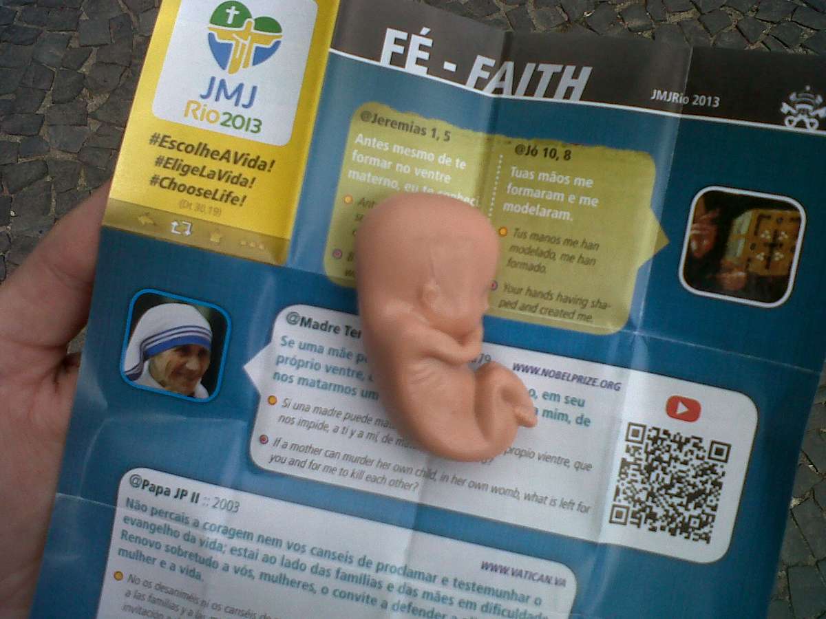Cerca de 400 pessoas organizadas pelo Movimento Nacional de Cidadania pela Vida (MNCV) - Brasil Sem Aborto, ligado à igreja católica, fizeram uma passeata na manhã deste sábado para protestar contra o aborto. Com faixas exaltando o "direito à vida", os manifestantes – muitos deles com camisetas da Jornada Mundial da Juventude - interrompem o trânsito na avenida Rio Branco, no centro do Rio, e distribuem bonecos representando fetos de 10 semanas à população.