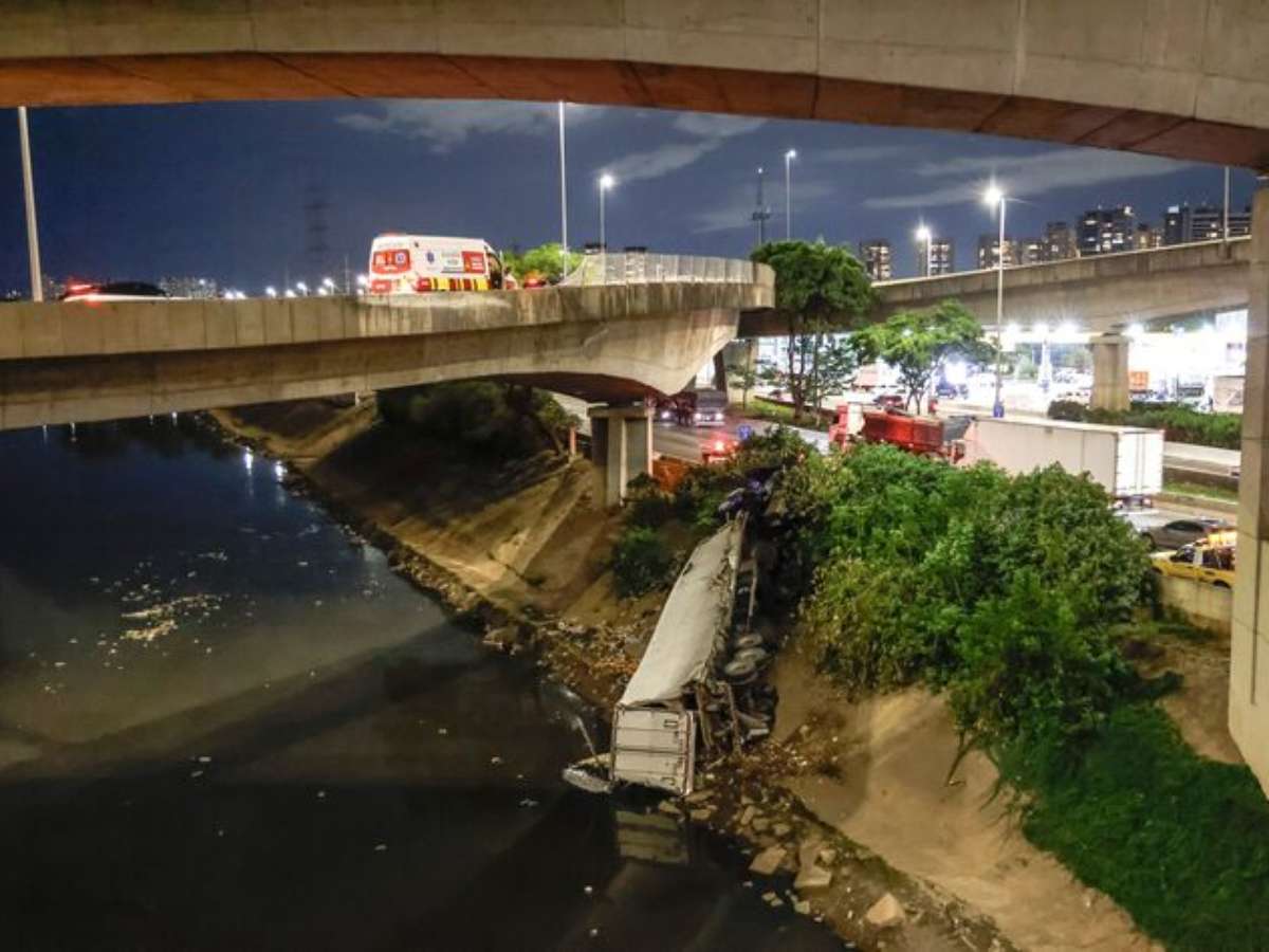 Caminhão com quatro pessoas cai de ponte na Marginal Tietê