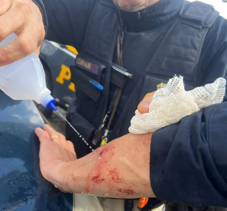 Outras fotos, divulgadas pela própria corporação, mostram outro agente lavando um ferimento no braço, que ainda sangra, e outro com a mão enfaixada.