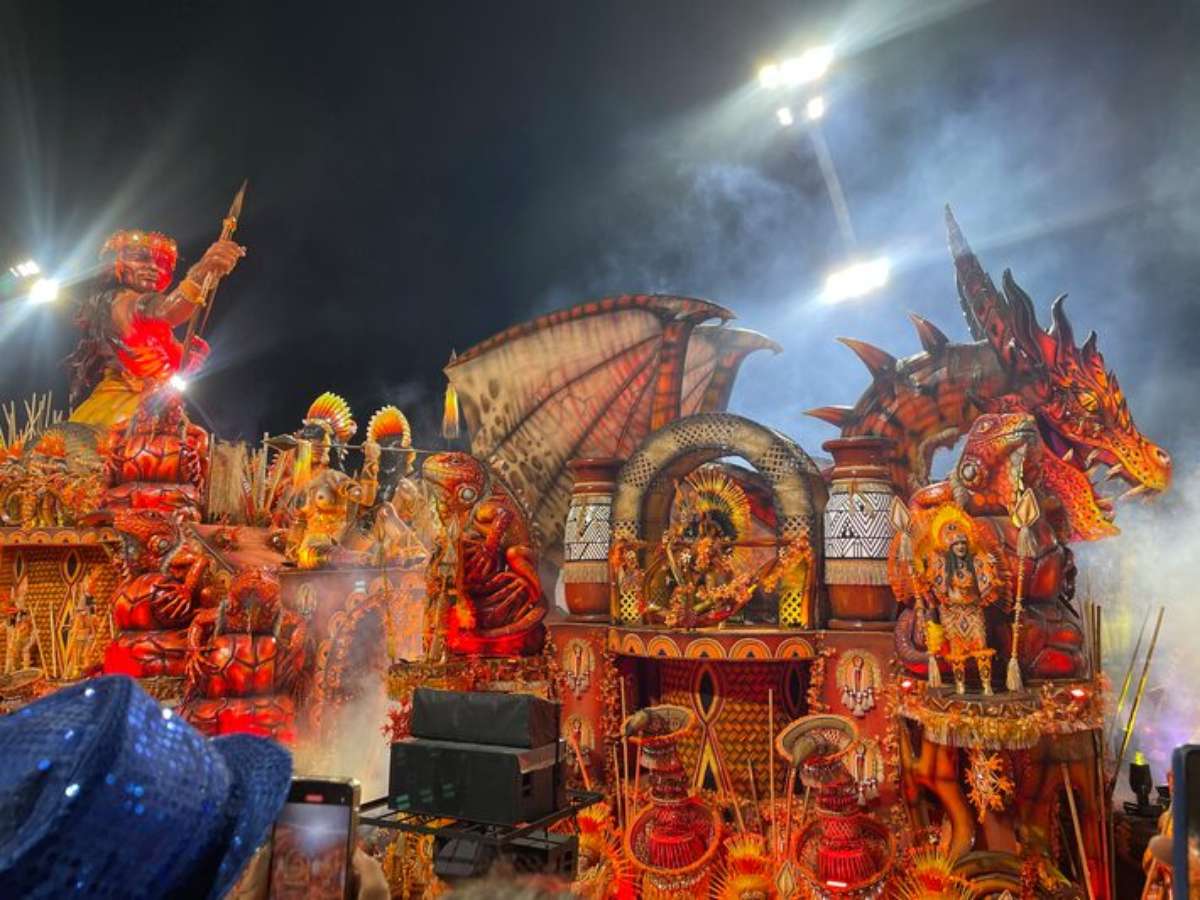Com carros de grande impacto visual — alguns com efeitos de movimento, luz e até fumaça no dragão de 12 metros do abre-alas —, a Dragões contou uma narrativa sobre coragem, liberdade e protagonismo feminino, exaltando a ancestralidade e a força dos povos originários.
