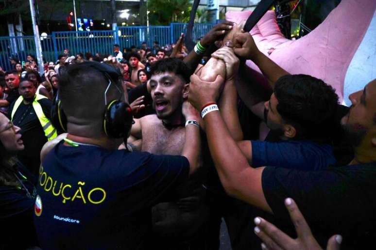 Pouco depois das 12h, no entanto, o bloco parou de andar, houve empurra-empurra e alguns foliões passaram mal. Os artistas interromperam por várias vezes a apresentação.