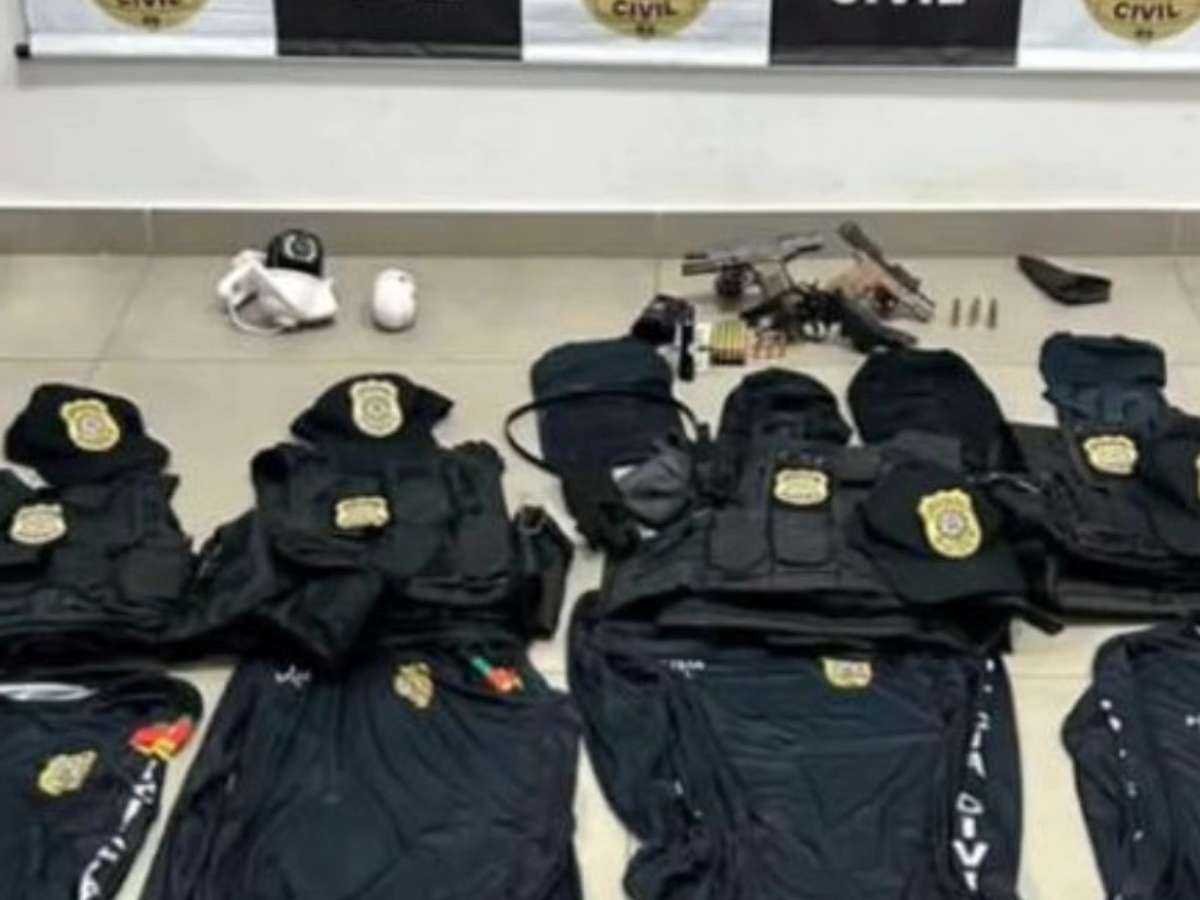 No interior do carro, os agentes apreenderam um arsenal composto por duas pistolas, um revólver, munições, coletes balísticos e vestimentas com identificação falsa da Polícia Civil. Um homem que estava no local foi preso em flagrante e encaminhado para os procedimentos legais. Todo o material recolhido passará por perícia técnica e será anexado ao inquérito.