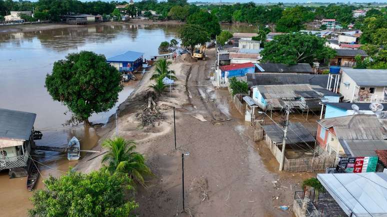 Devido à baixa do Rio Acre, ao menos duas casas e uma oficina desabaram em Rio Branco, capital do Estado, nesta quinta-feira (14). Além disso, quatro veículos foram arrastados pela água.