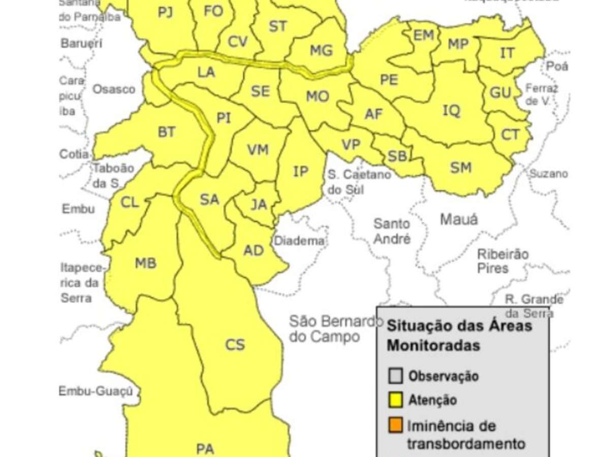 A Defesa Civil emitiu alerta para as zonas norte, leste, oeste, sul e centro da capital. Também houve registro de chuva com granizo em Santo André, região do ABC. Conforme balanço da concessionária Enel, de 14h12, havia 100,5 mil imóveis sem luz na cidade de São Paulo e na região metropolitana.