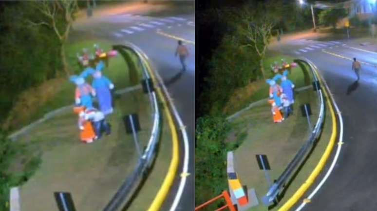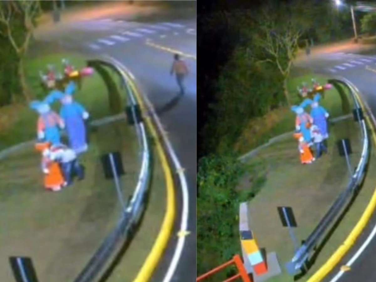 Nas imagens, é possível ver três homens andando por uma rua, na localidade de Seca Baixa. Um deles se aproxima do canteiro, pega um dos coelhos de Páscoa e segue adiante com o enfeite nos braços.