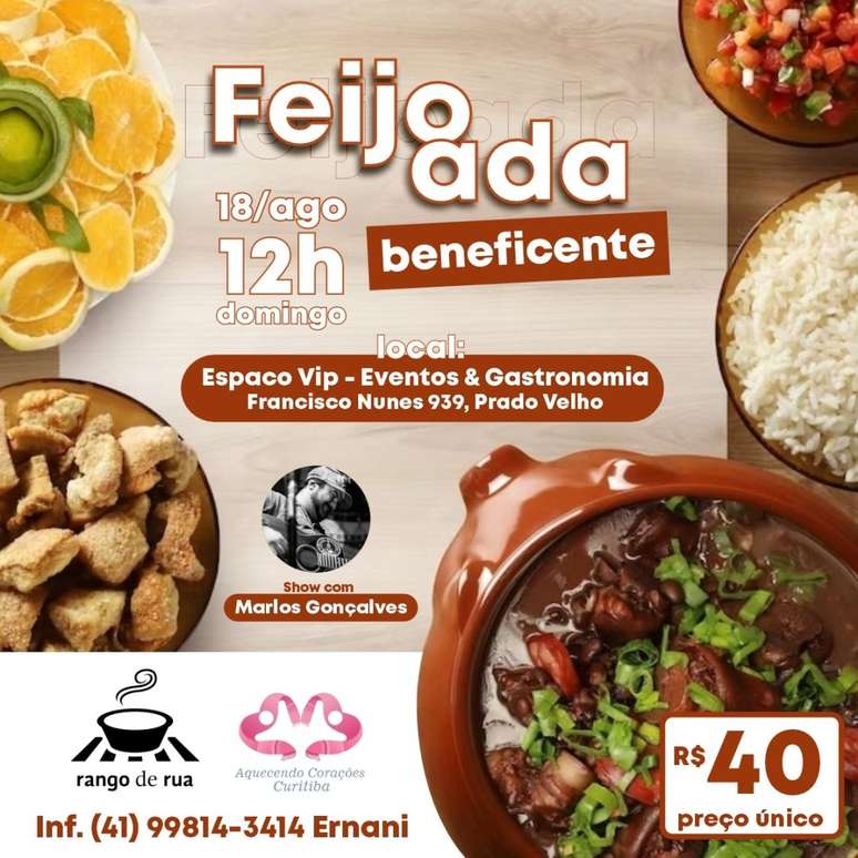 A "Feijoada Beneficente Rango de Rua e Aquecendo Corações" irá acontecer a partir das 12h. Haverá opções para marmitas e delivery, com taxa de R$ 15 em um raio de até 13 km do local. No dia, também haverá vendas de ingressos para participação.