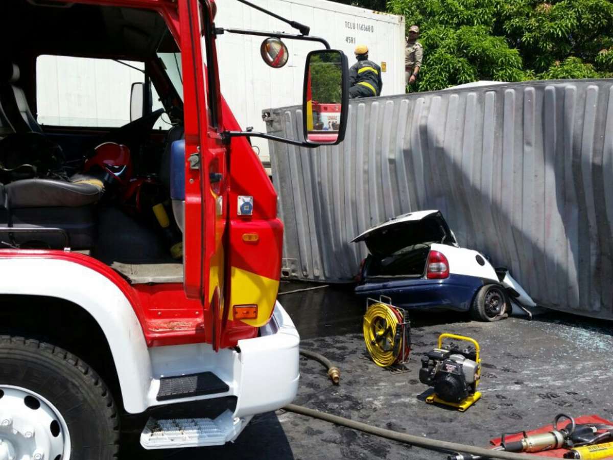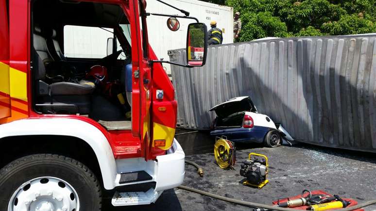 O resgate dos corpos durou mais de duas horas. Os bombeiros precisaram da ajuda de um guindaste para retirar o container de cima veículo atingido.