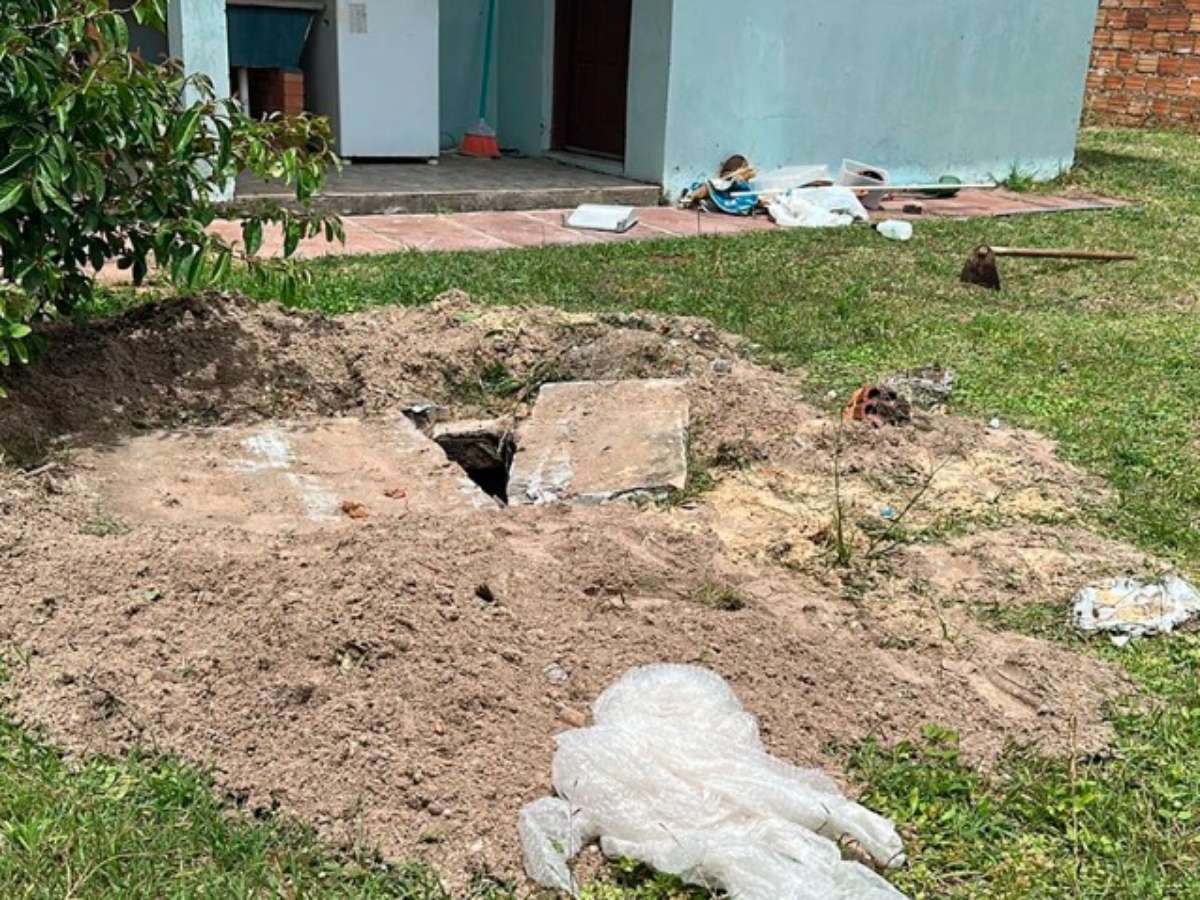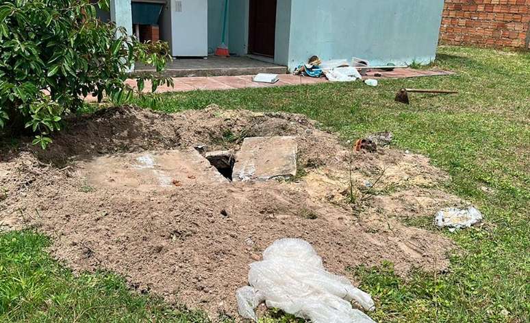 Com esses indícios, agentes foram ao local para verificar a situação. No pátio do imóvel, chamou a atenção uma área de terra remexida. A partir dessa observação, a equipe decidiu realizar buscas, chegando à fossa séptica onde o corpo estava enterrado.