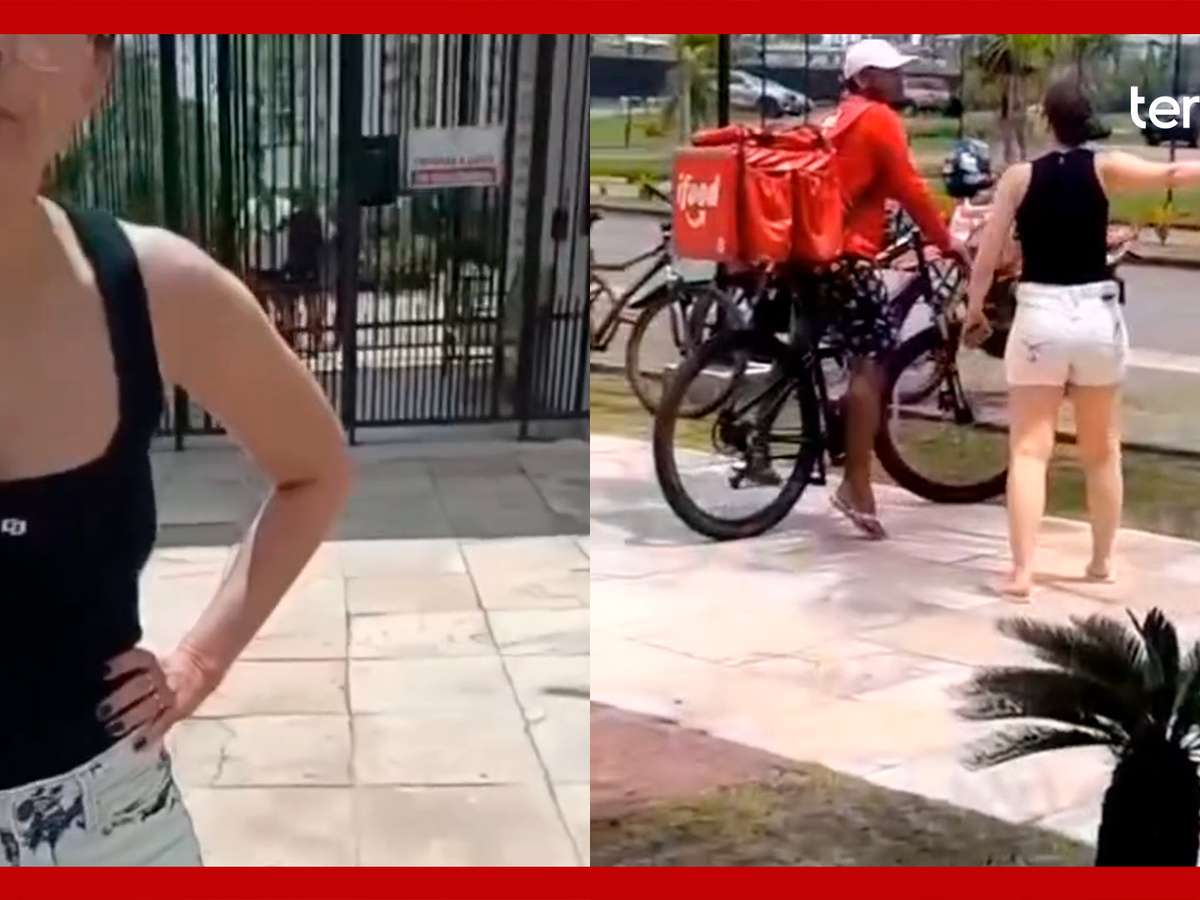O entregador começa a gravar a cena, e, então, ela recua. Ele insiste: "Vai, continua falando que eu sou vagabundo, que eu sou ladrão."