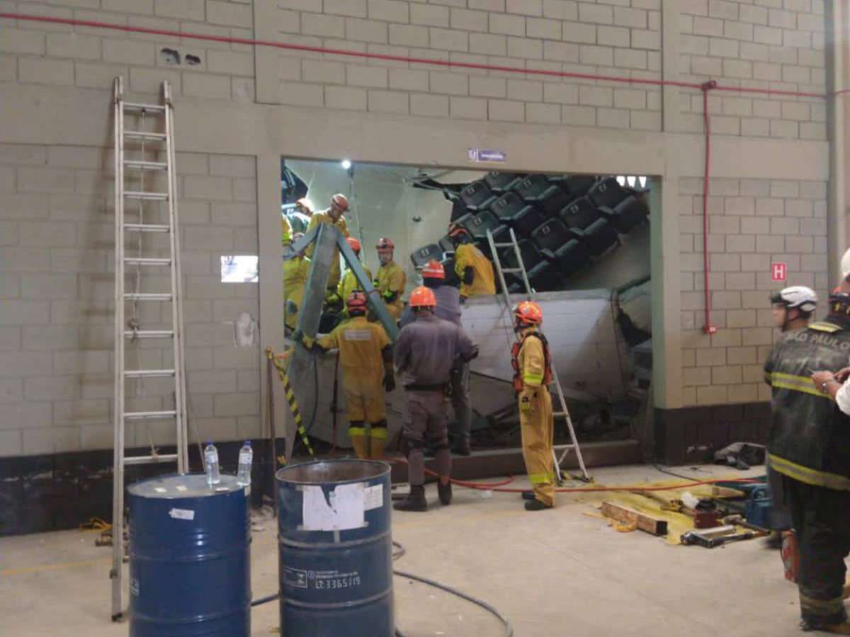 Imagens divulgadas pelo Corpo de Bombeiros mostram parte do interior do local do desabamento. No registro, bombeiros trabalham em meio aos escombros, incluindo o que parecem ser cadeiras de um auditório.