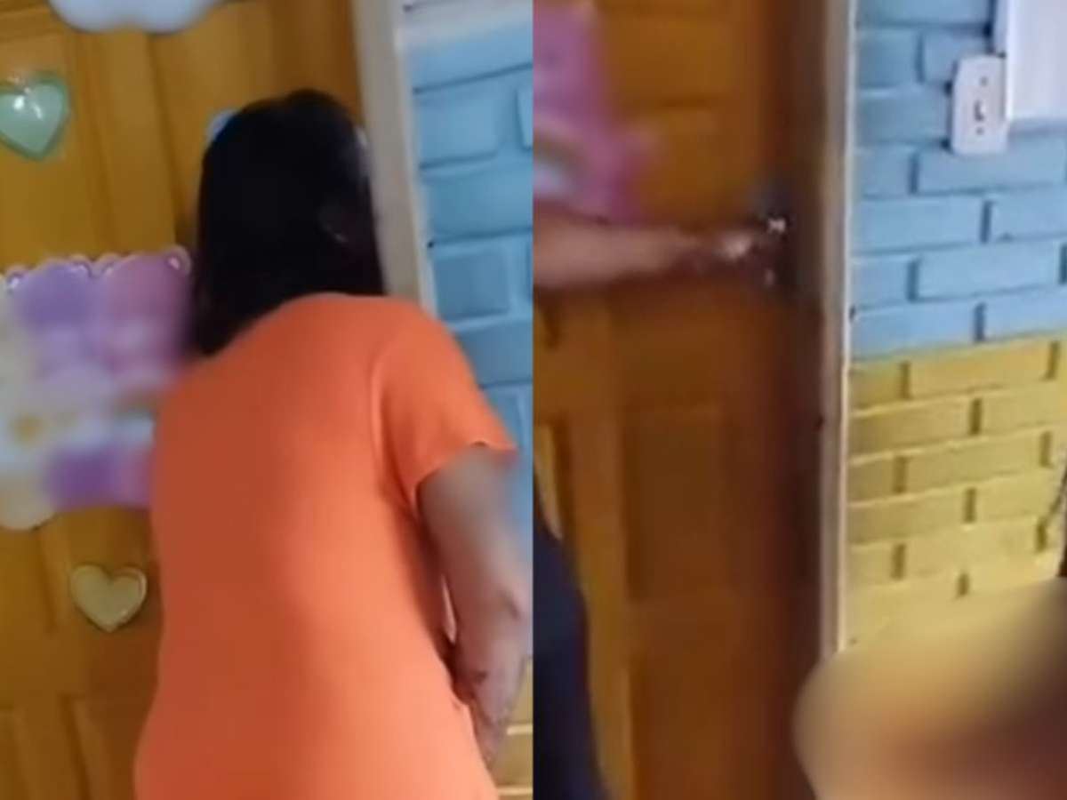 Nas imagens, ela aparece parada em frente a porta entreaberta de uma sala de aula e, quando outra mulher sai do local, ela balança o objeto.