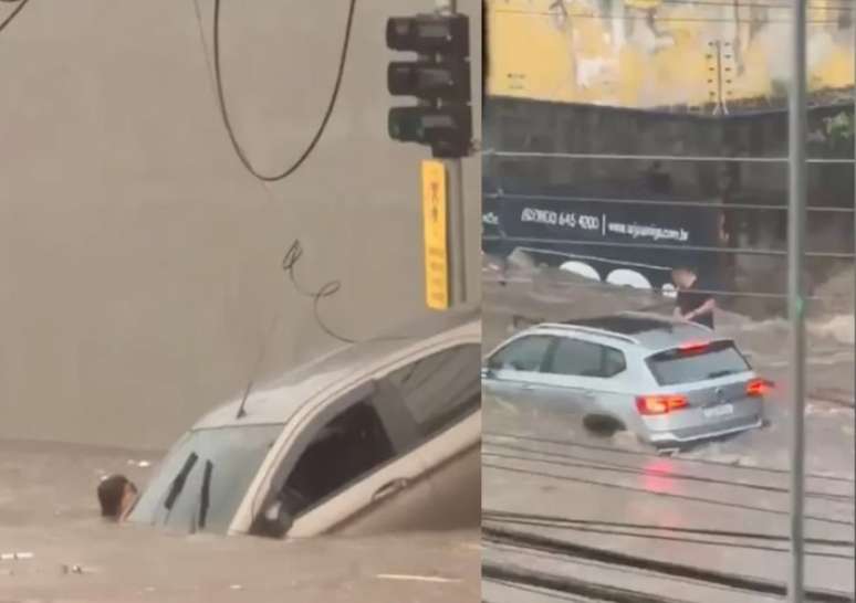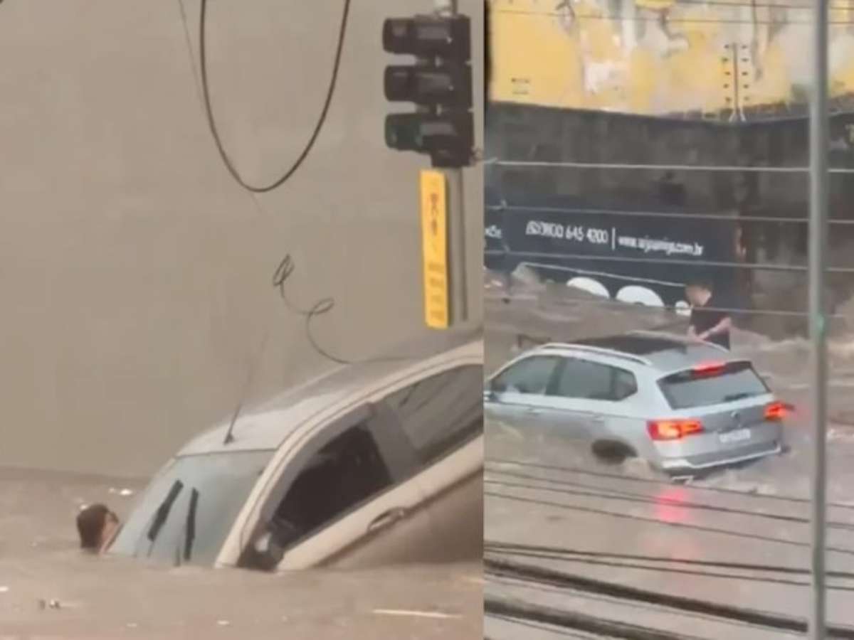Uma mulher chegou a ser arrastada pela correnteza e ficou submersa até a altura do pescoço. Ela foi resgatada pela equipe de salvamento. Imagens que circulam nas redes sociais mostram uma pessoa se segurando no retrovisor de um carro para não ser levada pela enxurrada.