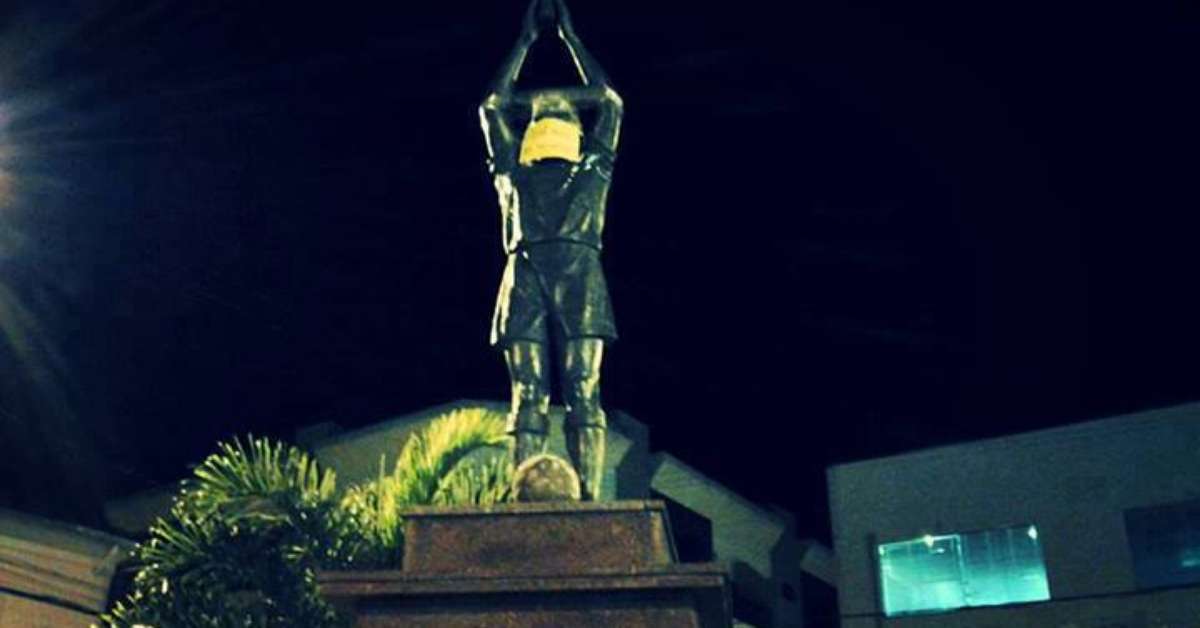A estátua do ex-jogador de futebol Edson Arantes do Nascimento, o Pelé, em Três Corações (MG) - sua cidade natal - foi "amordaçada" durante protesto na quinta-feira. A manifestação, que se soma a outras que ocorreram em todo o País e com diversas reivindicações, teve cerca de 1 mil participantes, afirma a Polícia Militar. Segundo o IBGE, a cidade tem 72 mil habitantes.