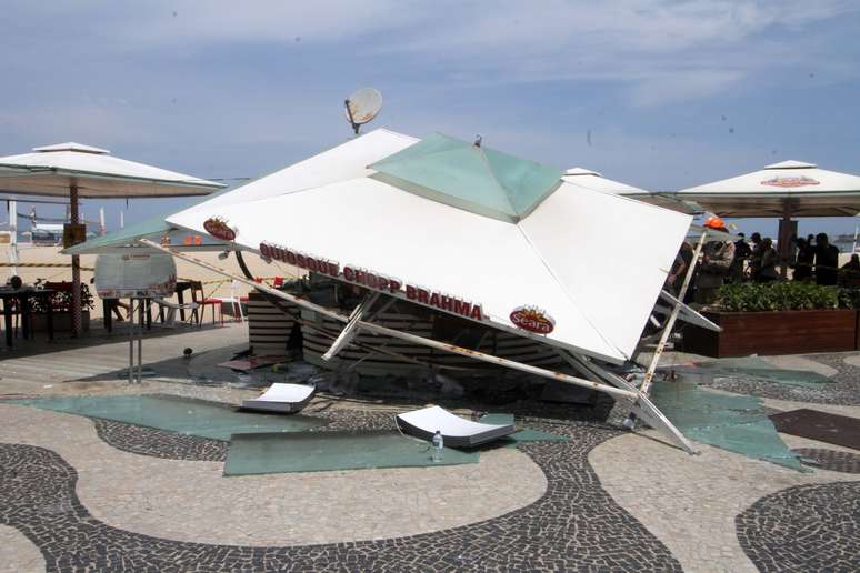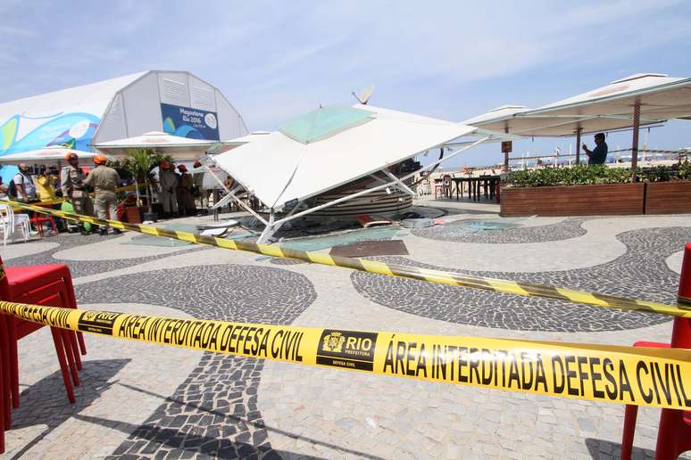 A estrutura do teto de um quiosque desabou nesta tarde, na Avenida Atlântica, na altura da Rua Figueiredo de Magalhães, no Posto 4, em Copacabana, ferindo seis pessoas. Segundo o Corpo de Bombeiros, quatro tiveram ferimentos leves e duas, ferimentos moderados. As vítimas foram encaminhadas para o Hospital Municipal Miguel Couto, na Gávea, também na zona sul. Os bombeiros informaram que a solda da haste de sustentação do teto do quiosque, onde fica a lona de proteção do sol, quebrou, e a estrutura desabou.