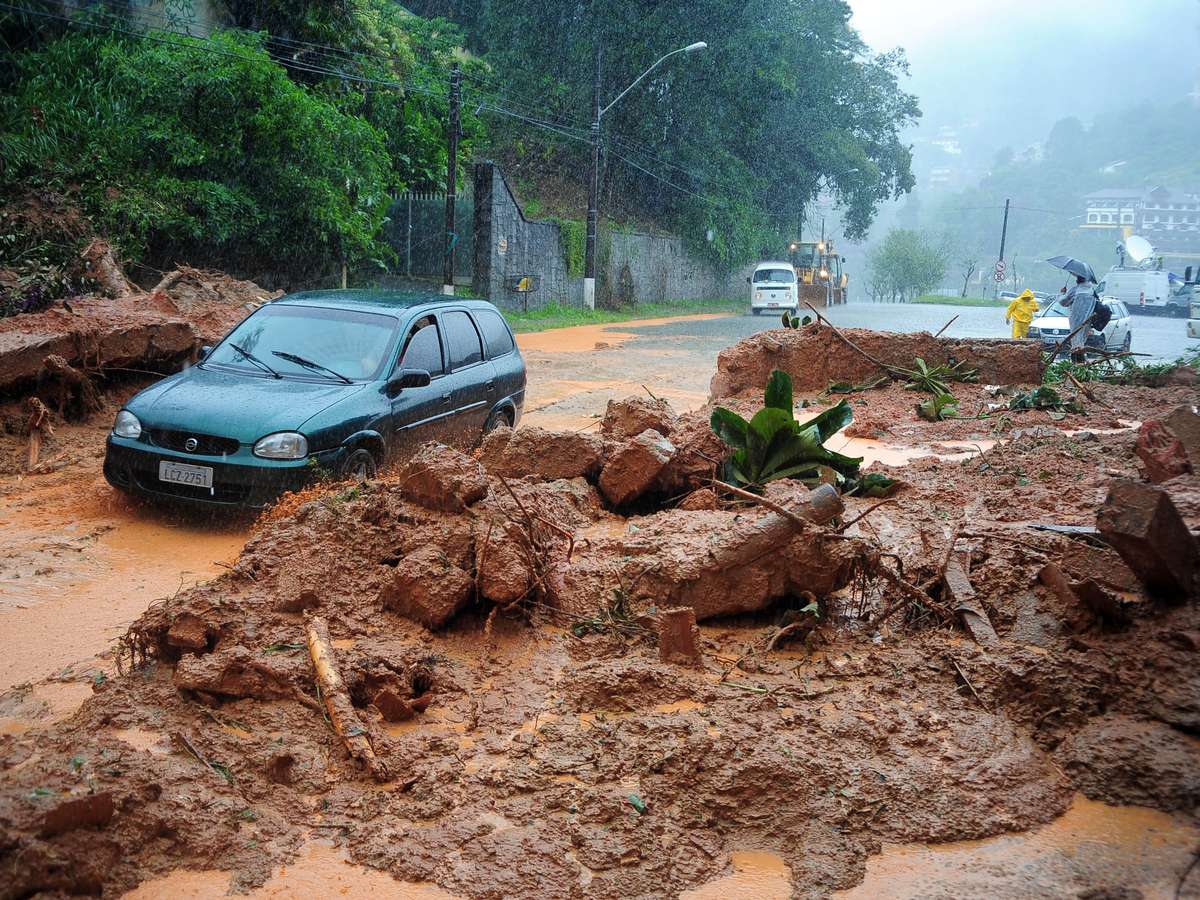 Chuva causa desabamentos e estragos nas ruas do Bairro Quitandinha em Petrópolis, nesta segunda-feira