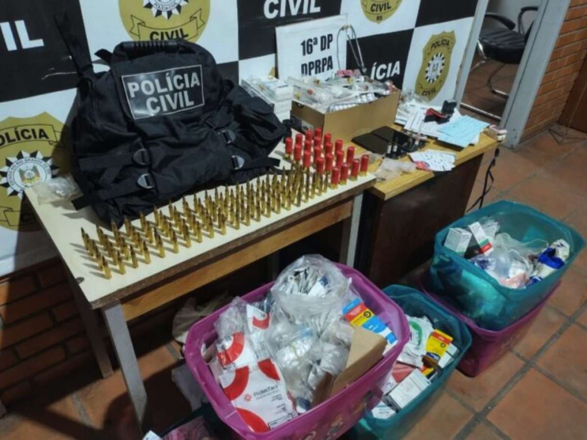 Durante o cumprimento do mandado de busca e apreensão, foram encontradas munições de fuzil calibre 556, cartuchos de espingarda calibre 12 com balote, além de colete balístico, drogas, e instrumentos para falsificação, como carimbos médicos e atestados em branco. Também havia um jet loader, equipamento usado para recarga rápida de armas, o que evidencia o grau de organização da operação criminosa.