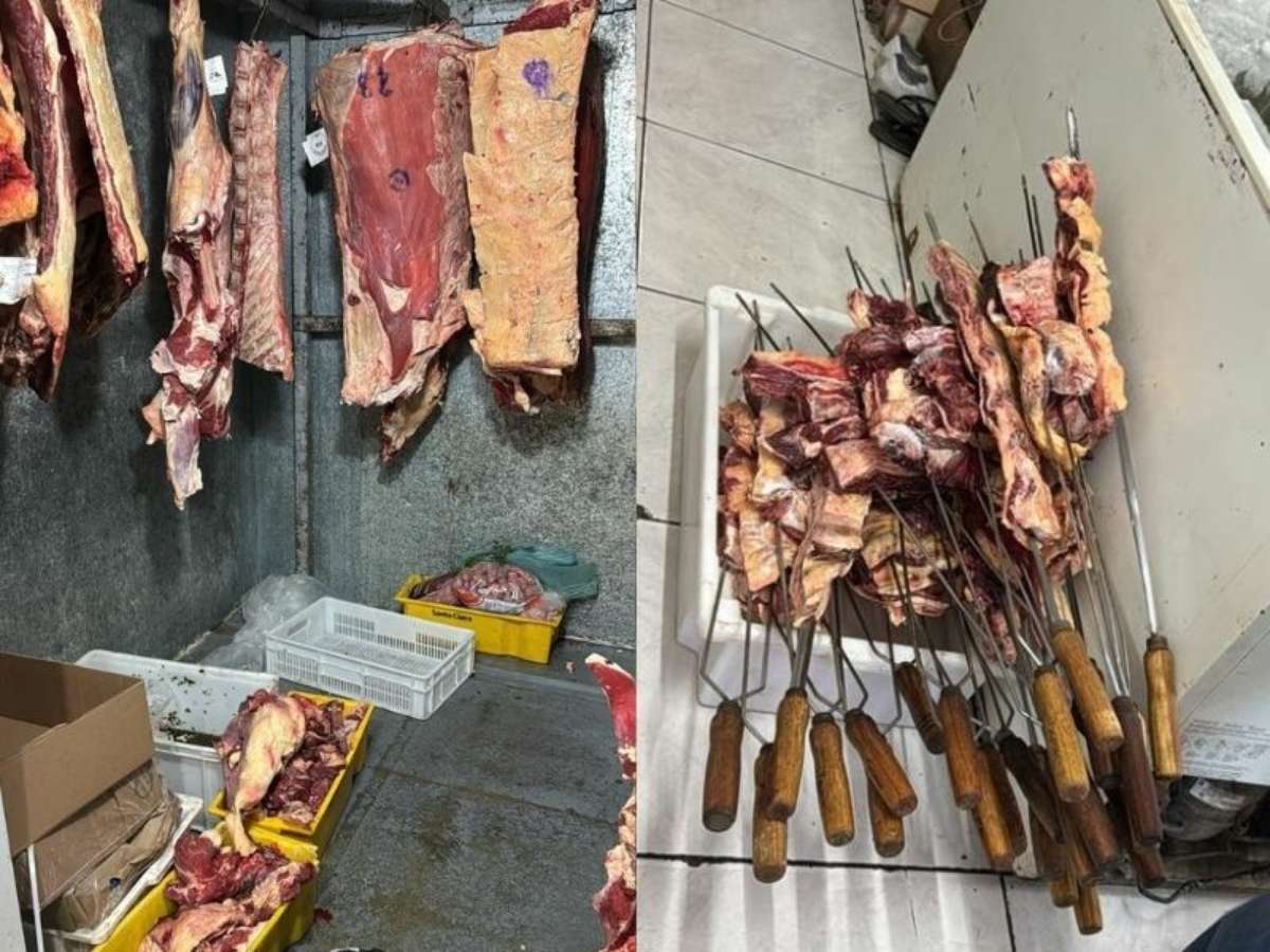 Entre os itens apreendidos, o maior volume foi de carne sem procedência, com mais de 1 tonelada localizada apenas no açougue. Os agentes também encontraram produtos diversos de origem desconhecida, como mel, aipim, queijos e carvão, além de alimentos com validade vencida, armazenados de forma inadequada e fora da temperatura indicada para conservação.