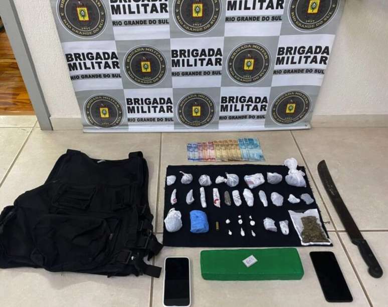 Durante a abordagem, os policiais encontraram em posse dos indivíduos 24 porções fracionadas de maconha, totalizando 316g, além de um tijolo pesando 804g da mesma substância. Adicionalmente, foram apreendidas seis porções de cocaína com peso total de 3,10g, bem como materiais empregados para fracionamento e embalagem de drogas, uma munição de calibre 38 intacta, uma quantia de R$479 em espécie e um colete balístico preto.