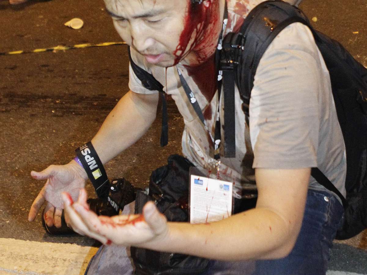 "Vi um manifestante cair no chão. Os policiais o agarraram e o levaram. Fotografava a cena quando fui bruscamente empurrado por outros policiais. Então levantei os braços com minha câmera para mostrar que era fotógrafo e que tinha intenções pacíficas, mas um policial de uniforme e escudo me acertou a cabeça com o cassetete", revelou.
