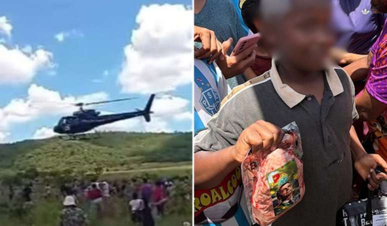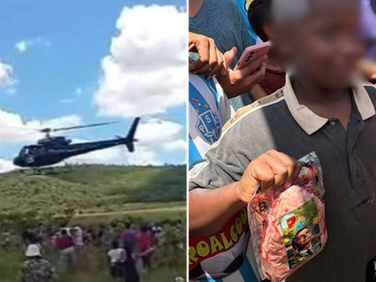 Em outro registro, o helicóptero aparece pousado enquanto pessoas, muitas de regiões periféricas, se reúnem para receber kits de churrasco, com crianças entre os presentes. Os pacotes de carne exibiam imagens do cantor Gusttavo Lima e do senador Flávio Bolsonaro (PL-RJ).