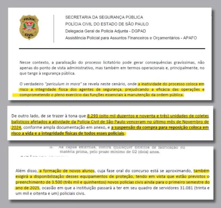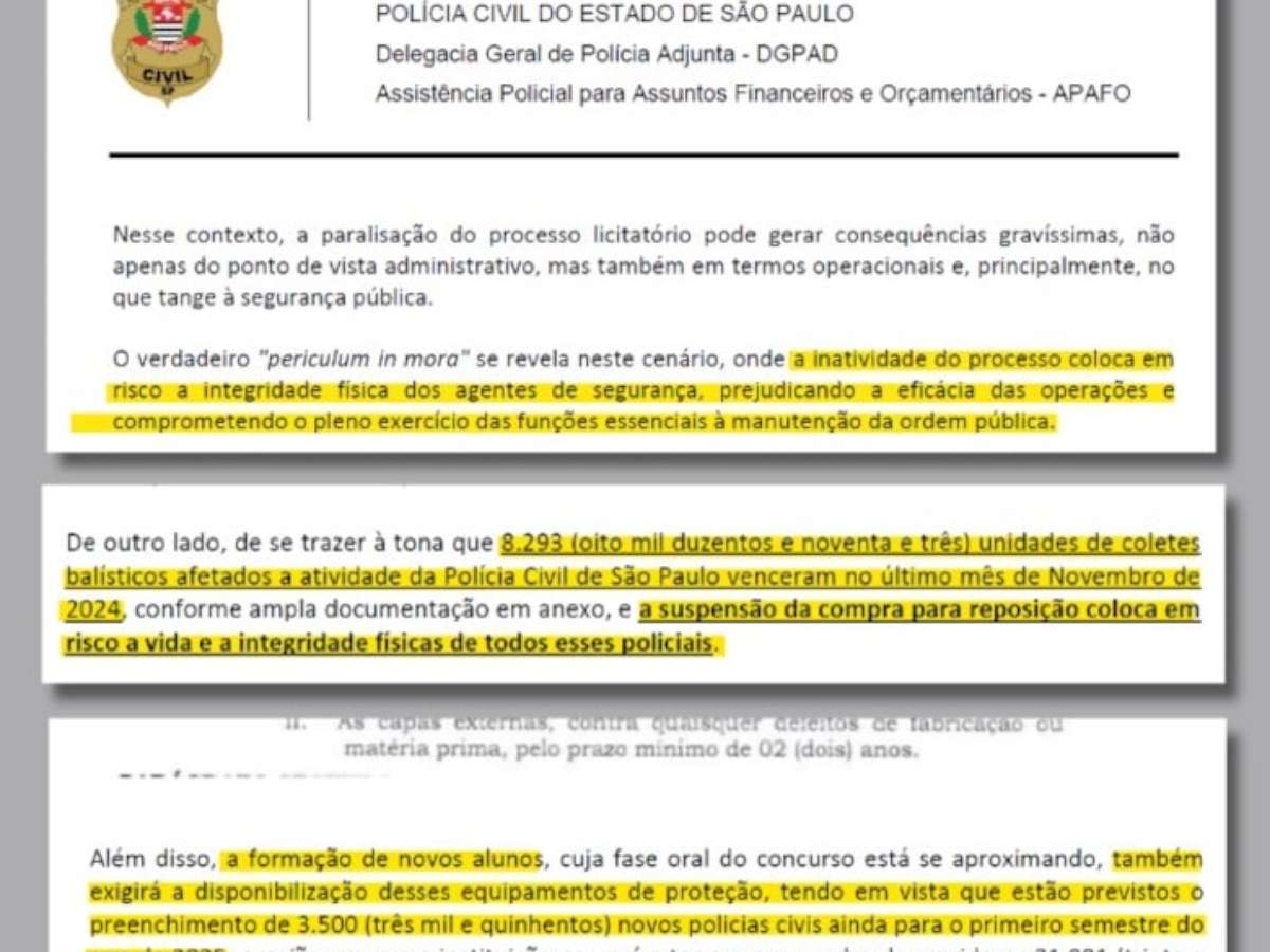 "A inatividade do processo [da licitação anterior] coloca em risco a integridade física dos agentes de segurança, prejudicando a eficácia das operações e comprometendo o pleno exercício das funções essenciais à manutenção da ordem pública", diz documento assinado em fevereiro pelo delegado-geral adjunto, Gilson César Pereira da Silveira.