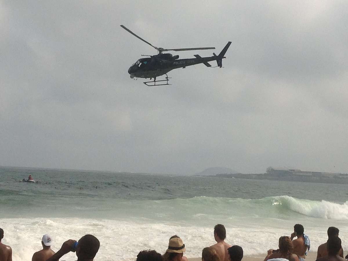 Helicóptero da Polícia Civil ajuda no resgate após um helicóptero dos Bombeiros fazer um pouso forçado na água da praia de Copacabana, no Rio de Janeiro
