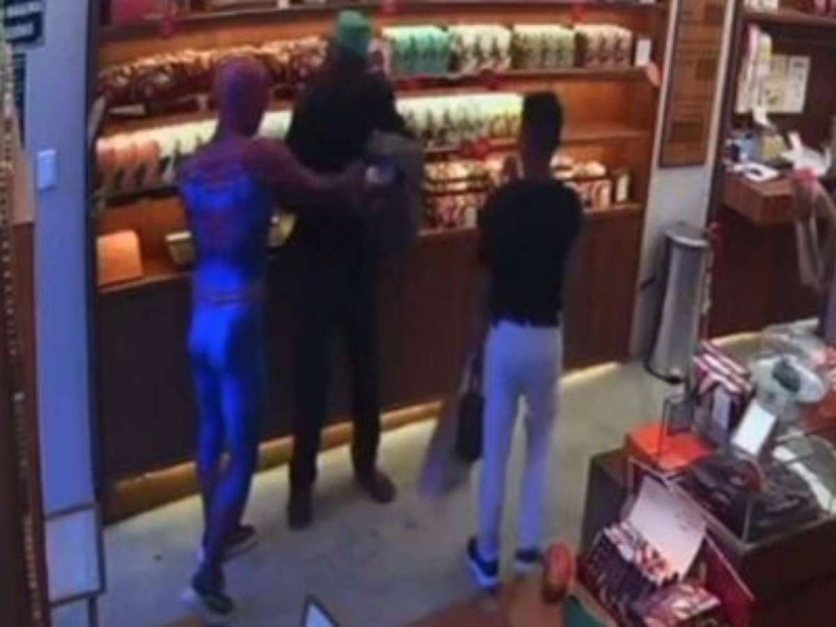 Nas imagens, dá para ver o momento em que o assaltante entra na loja e pega uma caixa de chocolate. Em seguida, o "Homem-Aranha" entra, recupera o produto e expulsa o suspeito do estabelecimento.