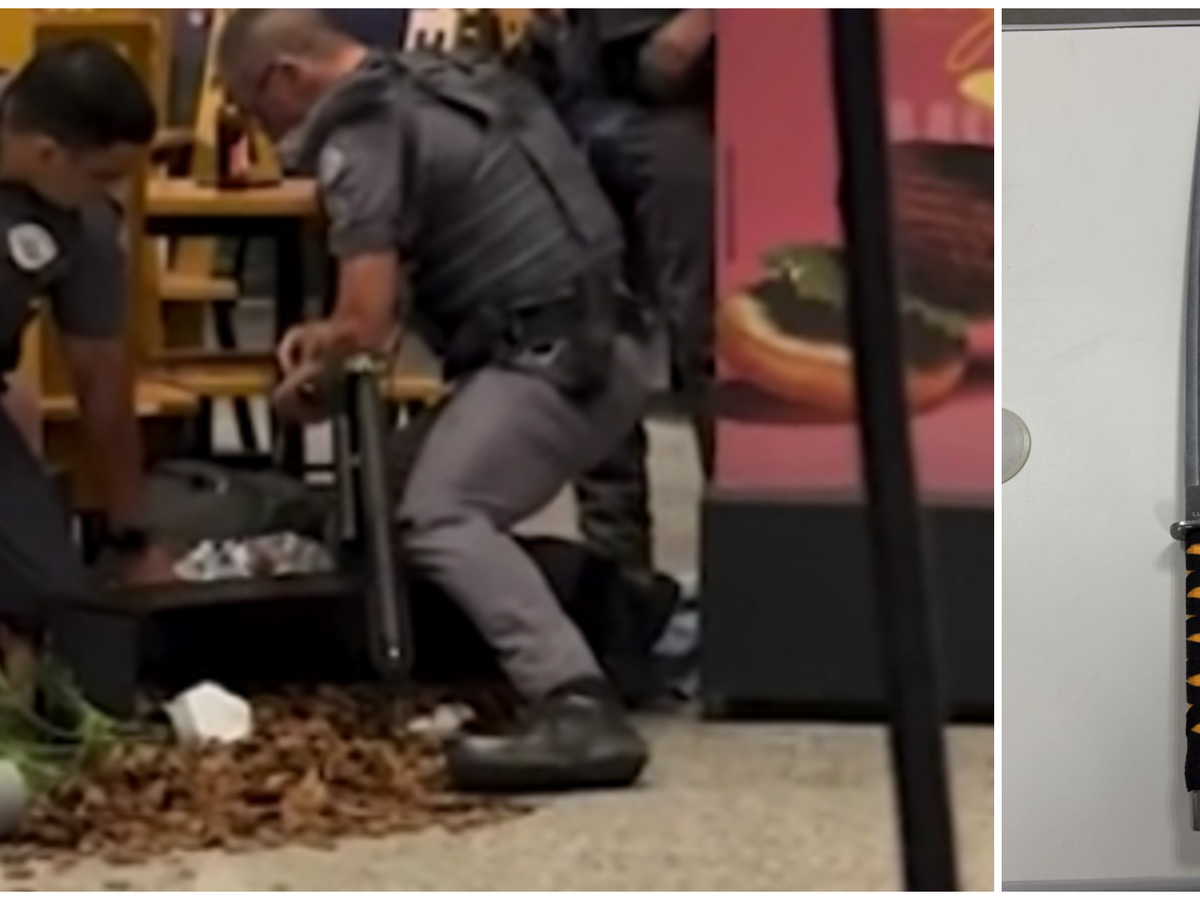 A espada foi apreendida e apresentada à autoridade policial. De acordo com o boletim de ocorrência, a espada é de metal prateado, com cerca de 47 cm de lâmina, cabo revestido de linha na cor amarela e preta.