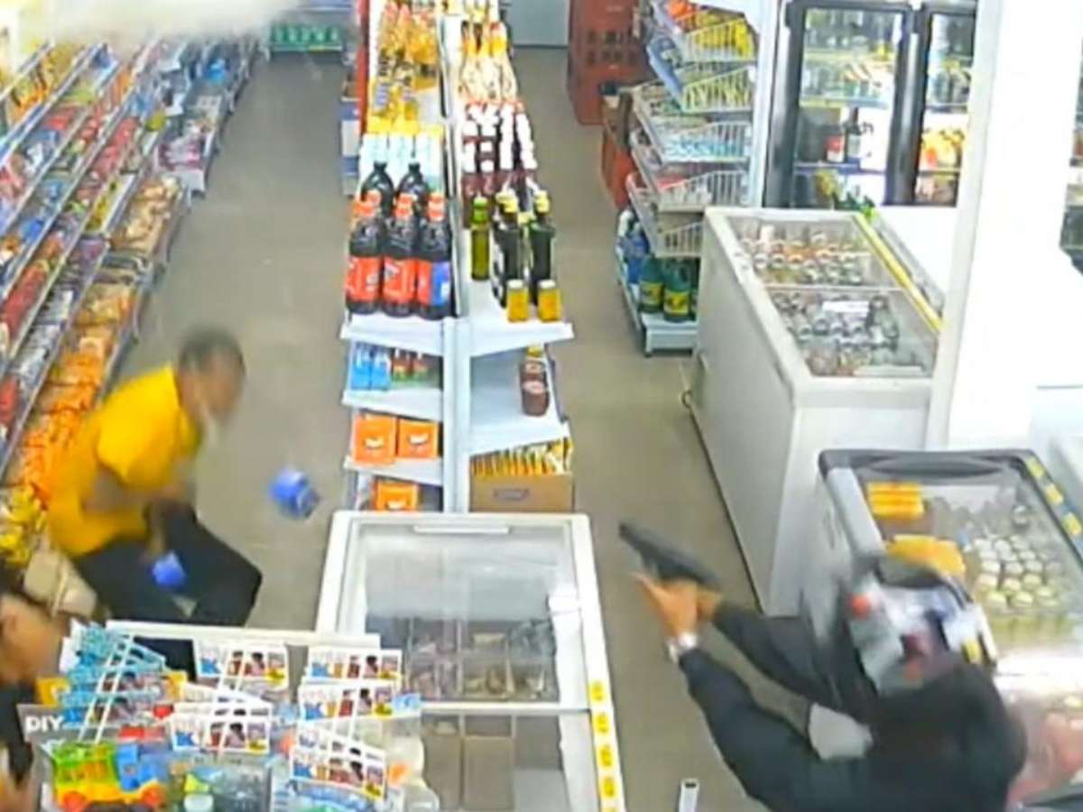 Em outro ângulo, é possível ver que além do casal, outras pessoas estavam no mercado. Uma criança e um homem saíram correndo do local quando ouviram os disparos.