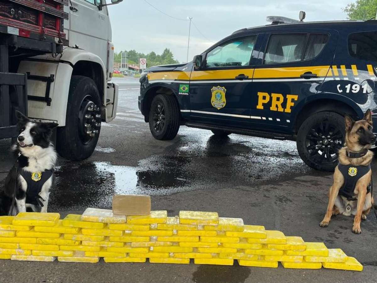 O veículo transportava sal paletizado e havia saído de Imbituba com destino a Bagé. Durante a fiscalização, os cães farejadores Jack e Guri indicaram a possível presença de material ilícito no caminhão.