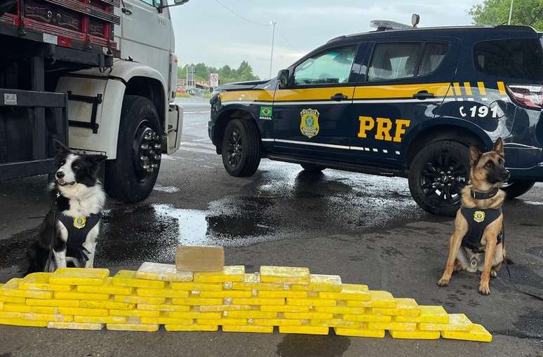 Os cães farejadores Jack e Guri localizaram a droga que era transportada escondida na estrutura de um caminhão.