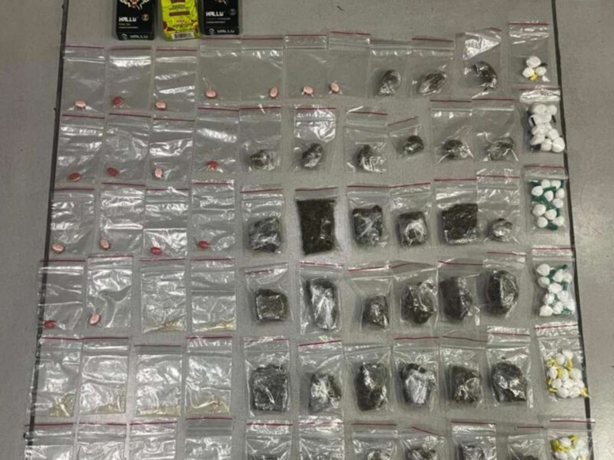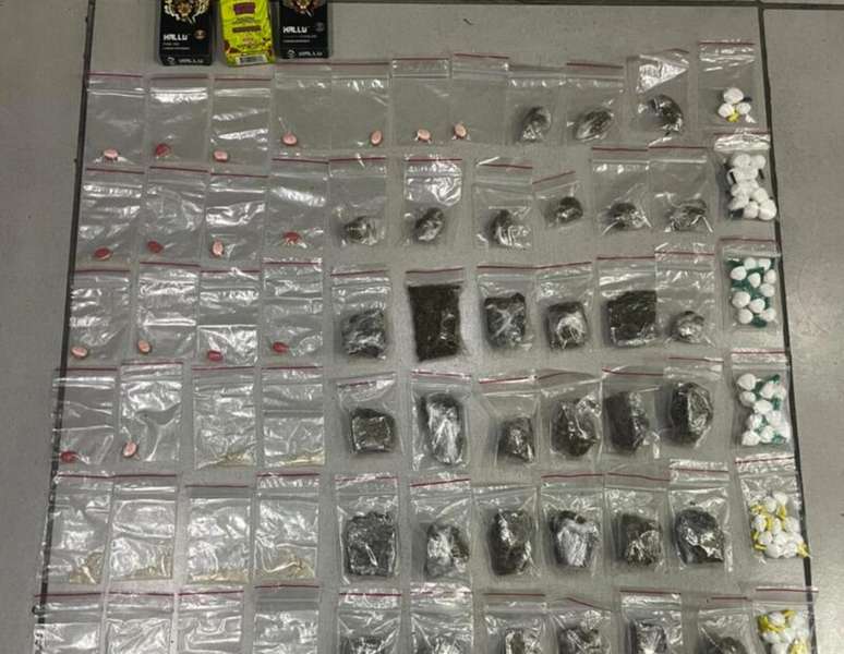 Foram encontrados com o suspeito 17 comprimidos de ecstasy, 33 buchas de maconha, 53 buchas de cocaína e 10 buchas de substância não identificada. A apreensão reforça a presença ativa do tráfico na região.