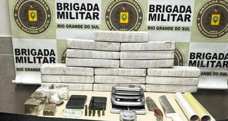 Durante a abordagem e a vistoria no interior do carro, os agentes encontraram tijolos e porções de maconha, além de diversos objetos comumente associados ao tráfico de drogas. No total, foram apreendidos 16 tijolos da droga, outras porções menores, balanças de precisão, munições de calibre .38, telefones celulares, facas e materiais utilizados para embalar entorpecentes. O veículo também foi recolhido.