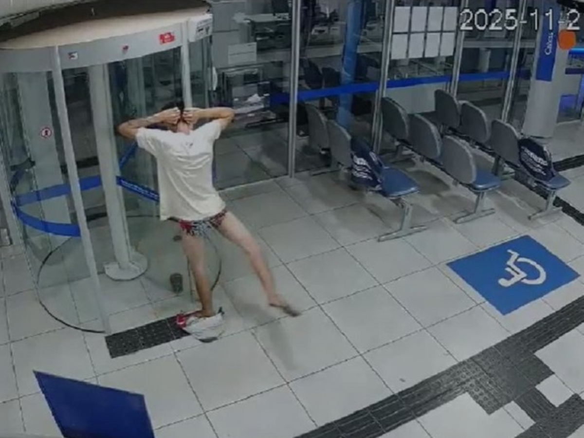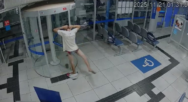Homem entala em porta giratória e fica de cueca ao tentar furtar agência de banco em MG; veja vídeo