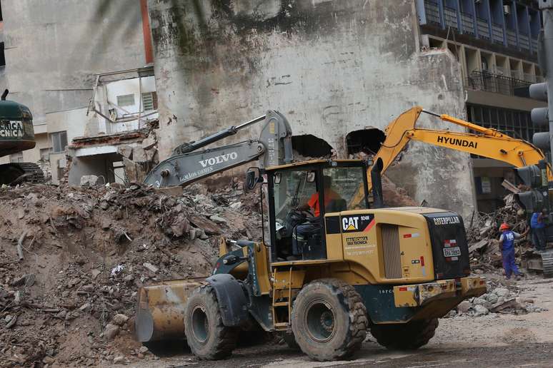 Bombeiros trabalham na busca pelos desaparecidos e retirada dos destroços do prédio que desabou após incêndio, no Largo do Paissandu (Rovena Rosa/Agência Brasil)